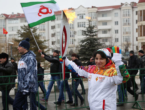 On Tuesday, in Magas, the capital of Ingushetia, about ten thousand people welcomed the Olympic Torch Relay in the main street. They came from many villages and towns of the republic.