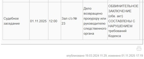 According to the case file on the court's website, the case against Pliev and Morozov was "returned to the prosecutor or head of the investigative body" on November 1 on the grounds that "the indictment (indictment) was drawn up in violation of the Code's requirements." The date of the next hearing, as of 8:00 a.m. Moscow time on November 2, is not indicated in the case file.
